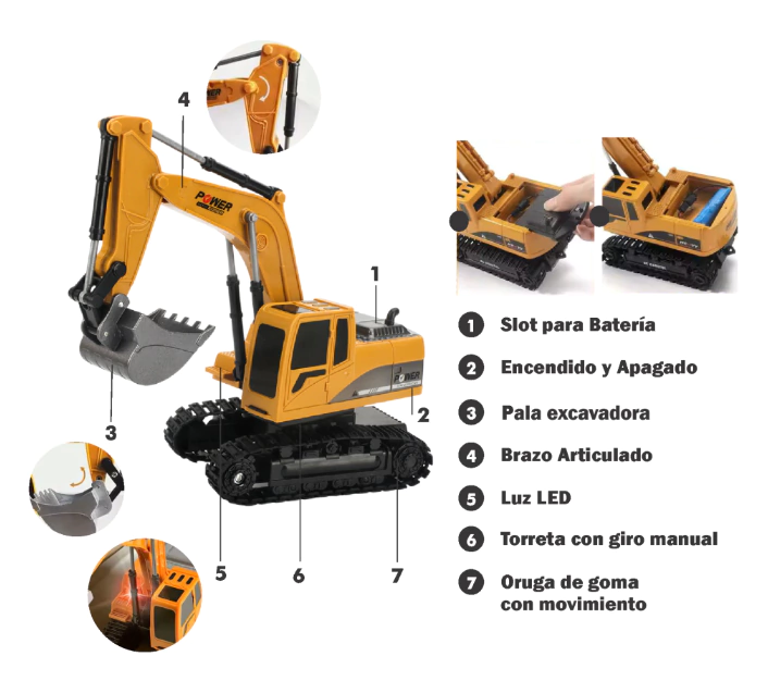 Esta increíble grúa a escala 1:40 trae la construcción a la palma de tus manos. Con su mando a distancia, podrás manejar movimientos completos: girar 360°, avanzar, retroceder y mover la pala con iluminación incluida, para una experiencia realista y divertida.